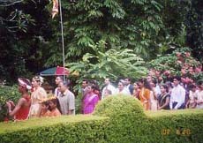 名前はスランガ、年令は28才。職業はビジネスマン。カーストは私の家と同格です。ルクマリーは一人娘なのでダウリー(持参財産)には家具・宝石・お金の他に家一軒をつけられました。スランガは一人息子で親と同居なのでダウリーの用意した家は空き家のままになってしまいました。スリランカも「家を継ぐ」ことが結婚の主目的なので、子供の数が少なった最近では長男長女、一人っ子同士の結婚が増え、これからは日本と同じ問題が起こってくるのではないかと思います。花嫁にブーケを渡す親戚の女の子達をフラワーガール、花婿のお供をする親戚の男の子達をページボーイと呼びます。 式場(普通はホテル、家でする時は花嫁の家)の庭ではスリランカの伝統的な踊りと太鼓で花嫁・花婿を出迎えます。ルクマリーの場合は私の家のゲストハウス(ホテルも兼ねています)で行いました。 決められた時間になったら式台(ステージ)に両サイド(向かって右から花嫁、左から花婿)から上がります。付き添うのはそれぞれの叔父にあたる人です。 パーリー語でお祝いのお経を読んでもらいますが二人の足元にはブラットの葉の上にココヤシ、稲、フルーツとコインをお供えします。